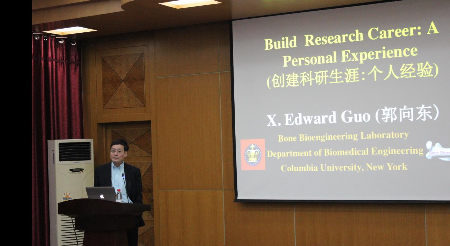 郭向東教授在骨生物力學(xué)、骨對力學(xué)荷載的適應(yīng)及其細(xì)胞/分子機(jī)制、生物組織的計算模型、細(xì)胞生物力學(xué)、骨微結(jié)構(gòu)的影像學(xué)分析、細(xì)胞微觀影像等領(lǐng)域有眾多突出研究成果。曾擔(dān)任美國力學(xué)工程師協(xié)會固體力學(xué)專業(yè)委員會副主席,生物醫(yī)學(xué)生理調(diào)節(jié)協(xié)會主席,國際華人骨研究會主席等職位。榮獲美國國家健康學(xué)會的國家研究貢獻(xiàn)獎、美國國家自然基金事業(yè)獎以及2007年中國海外杰出青年獎。主要學(xué)術(shù)兼職有美國國家生物力學(xué)委員會委員,美國骨外科研究協(xié)會董事會董事、世界生物力學(xué)委員會會員,美國醫(yī)學(xué)及生物工程學(xué)院會士,美國醫(yī)學(xué)及生物工程學(xué)院董事會董事等。此次郭向東教授及其一行與我校生物物理研究所就開展合作達(dá)成了初步意向。