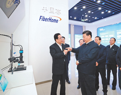 26日上午,習(xí)近平先后來到位于東湖高新區(qū)的烽火科技集團和武漢新芯集成電路制造有限公司,考察企業(yè)創(chuàng)新發(fā)展情況。東湖高新區(qū)是首批國家級高新區(qū),2016年獲批中國(湖北)自由貿(mào)易試驗區(qū)武漢片區(qū)。這里是全球最大的光通信研發(fā)生產(chǎn)基地,被譽為“中國光谷”。在烽火科技集團,習(xí)近平聽取武漢市新舊動能轉(zhuǎn)換發(fā)展情況匯報,察看企業(yè)自主創(chuàng)新成果展示,了解企業(yè)優(yōu)化調(diào)整產(chǎn)業(yè)結(jié)構(gòu)和加強黨建工作等情況。展廳里陳列著烽火科技集團以及長飛光纖光纜股份有限公司研制的芯片、光纖等高科技產(chǎn)品。習(xí)近平一邊察看實物一邊了解產(chǎn)品用途、性能、國產(chǎn)化率、在國際同行業(yè)中的地位等情況。聽到介紹烽火科技在“超大容量、超長距離、超高速率”光通信領(lǐng)域的研發(fā)和生產(chǎn)處于世界領(lǐng)先地位,一根光纖上可實現(xiàn)67.5億對人同時通話,總書記點頭表示贊許。他語重心長對企業(yè)負責(zé)人說,新發(fā)展理念,創(chuàng)新是第一位的。我國已經(jīng)成為世界第二大經(jīng)濟體,過去那種主要依靠資源要素投入推動經(jīng)濟增長的方式行不通了,必須依靠創(chuàng)新。具有自主知識產(chǎn)權(quán)的核心技術(shù),是企業(yè)的“命門”所在。企業(yè)必須在核心技術(shù)上不斷實現(xiàn)突破,掌握更多具有自主知識產(chǎn)權(quán)的關(guān)鍵技術(shù),掌控產(chǎn)業(yè)發(fā)展主導(dǎo)權(quán)。國家需要你們在這方面加快步伐。他要求企業(yè)加強黨建工作,以黨建引領(lǐng)促進企業(yè)創(chuàng)新發(fā)展。