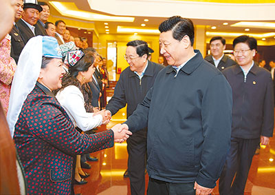 2014年4月30日上午,正在新疆考察工作的中共中央總書記、國家主席、中央軍委主席習近平在烏魯木齊接見勞動模范和先進工作者、先進人物代表,并同他們座談。這是習近平與勞動模范和先進工作者、先進人物代表親切握手。新華社記者謝環馳攝