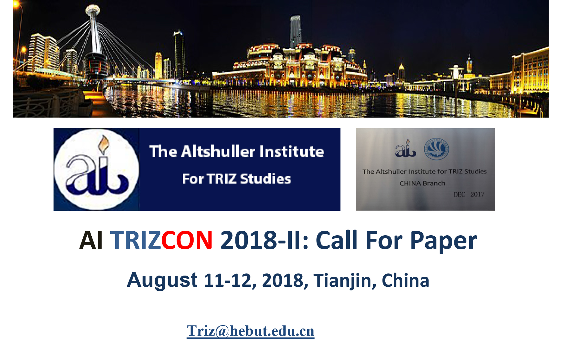 For the purpose of open presentations, discussions and communications on the TRIZ, its development and application in industries. The China Branch of The Altshuller Institute For TRIZ Studies is going to hold International Conference: AI TRIZCON 2018-II in Tianjin. Every One who is interested in TRIZ is welcome to your contribution to the conference.